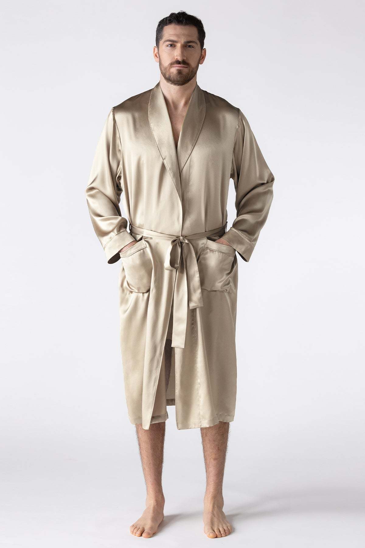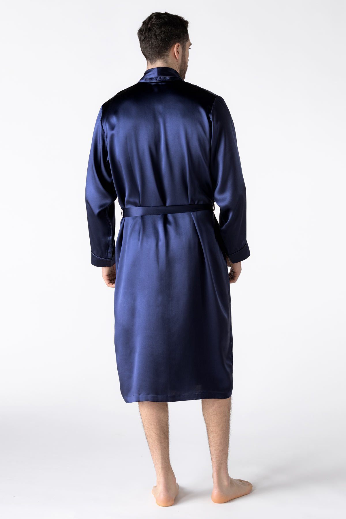 NK Mens Silk Robe This silk robe is a timeless piece for men who prioritize self-care. The NK Men Robe is fit for a king, allowing you to feel your most luxurious each day with the softest biodegradable fabric and an easy fit for the best in comfort. Available in three rich colors to match your individual style. Wear this robe over the NK Men PJ Top and either the NK Men PJ Boxer or the NK Men PJ Pant. Garment Details - Stylish shawl collar. - Sophisticated piping for a unique aesthetic. - Functional side pockets for convenience. - Made with 100% biodegradable fabrics. Material: 100% Silk Charmeuse NK IMODE exclusively uses OEKO-Tex certified silks, made without chemicals harmful to you and the environment. Garment Length: 48 7/8 / 124 cm inseam. Models Measurements: Waist: 34 | Inseam: 34 | Shirt: 16 Model is wearing a Medium size.