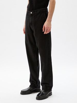An indigo denim trouser with a slight dropped crotch, slanted side pockets at front with two patch pockets and a yoke at back. Each pair has a unique handwritten denim label. Also available in Washed Black.