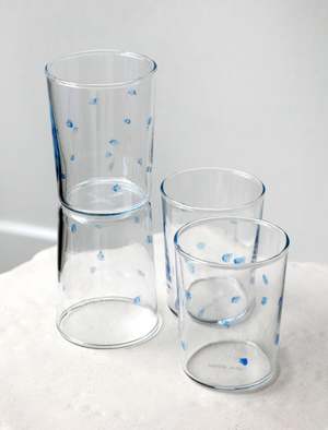 Delicate to hold yet sturdy to use, the Soft Serve glasses are made from high quality borosilicate glass, a glass usually found in laboratories for its reliable durability. Available in three variants, each set contains four glasses. Flecks of blue touch the sides of each, leaving their unique print that unites the set. - Made in Denmark - 4 x 3 - Set of 4 - Hand wash with sponge, dishwashing not recommended