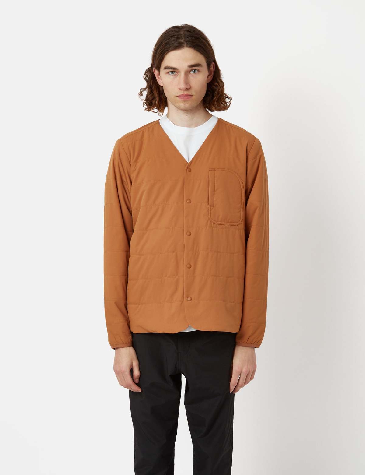 The Flexible Insulated Cardigan from Snow Peak is part of the signature Snow Peak Flexible Insulated collection. This versatile, functional garment can can be worn on its own during transitional weather and as a layering piece during the colder months. Featuring a v-neck snap button placket, with dual side seam pockets, a check pocket and cut with a straight body. Article Fit & Features Material: Shell: 100% Nylon (DWRAC) / Filling: 100% Polyester (40% Recycled) / Lining: 100% Polyester Fit: Traditional Japanese sizing. We recommend taking the next size up. V-neck Dual side seam pockets Check pocket Straight body Product SKU: SW-23SU001-BR
