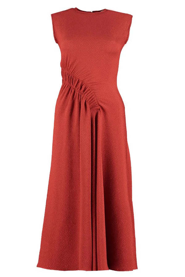 The Pina Dress in Carmine by Edeline Lee is a sleeveless, draped midi dress with ruched panel detailing. The tightly fitted bodice, side gathers, and flaring asymmetrical hem comes together to create a stunning and effortless silhouette. - 96% Polyester 4% Elastane - Dry Clean Only - Made in England - Flou Bubble Jacquard woven in Italy