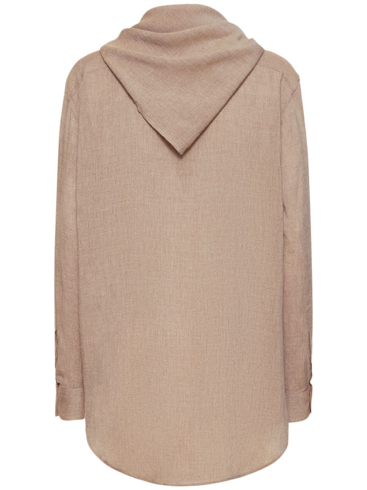Front button closure. Button cuffs. Non-detachable self-tie scarf . One breast patch pocket. Model is wearing a size36