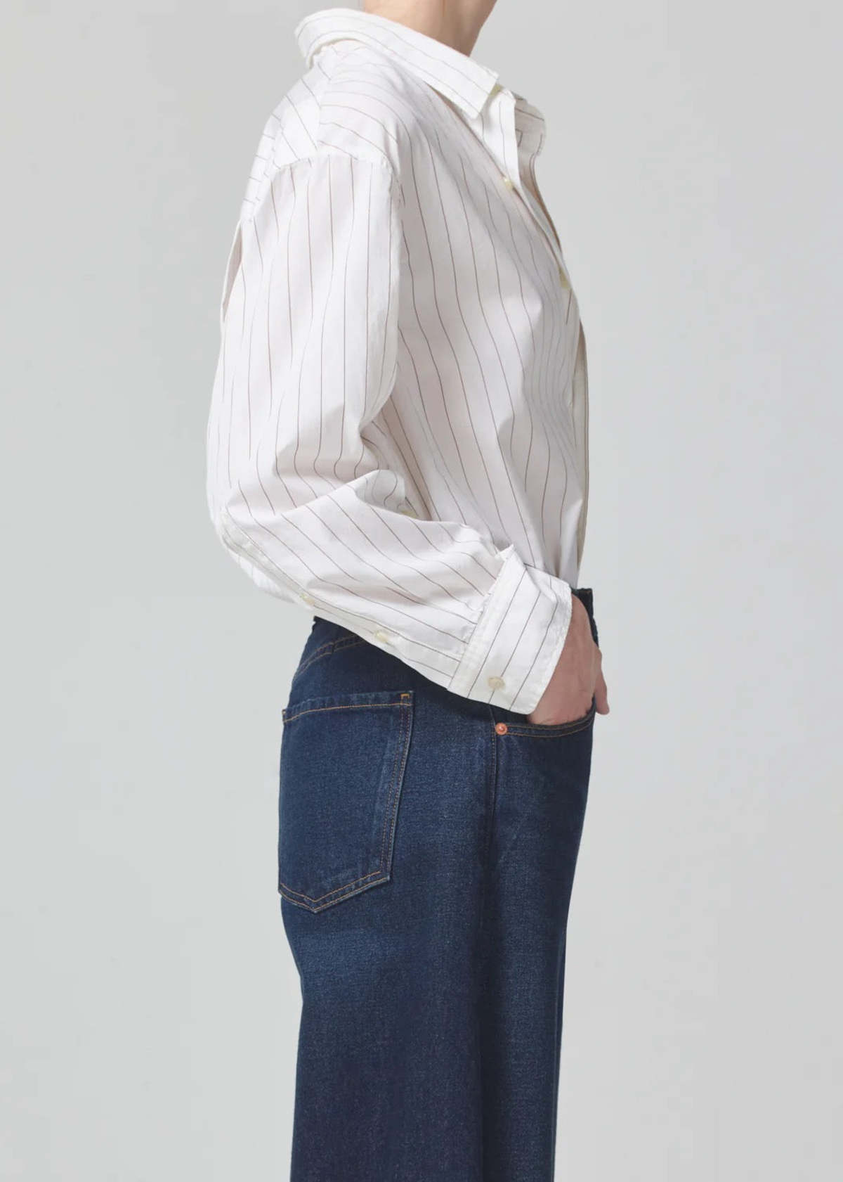 Citizens of Humanity Kayla button up shirt in bitter chocolate stripe. An oversized silhouette and high-low hem give new dimension to a timeless staple. Buttons on sleeve to give loose rolled up sleeve effect. This fit is intended to be relaxed. Size down for a closer fit. Body Length: 30 1/4", Shoulder to Shoulder: 19 3/4", Sleeve Length: 22" Model is 5'10" and wearing a size Small. 100% Cotton. Machine wash inside out. Made in Vietnam with imported materials