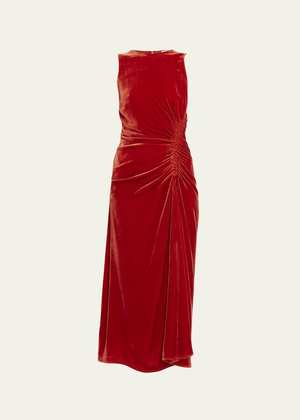 The Cornelia Dress is made from a luxurious liquid velvet in Carnelian red. This sleeveless midi dress features a round neckline and gorgeous ruching that defines the silhouette and cascades down to the front split. It is finished with a concealed side-seam zipper and back button keyhole. 80% Viscose, 20% Silk. Dry clean. Imported.