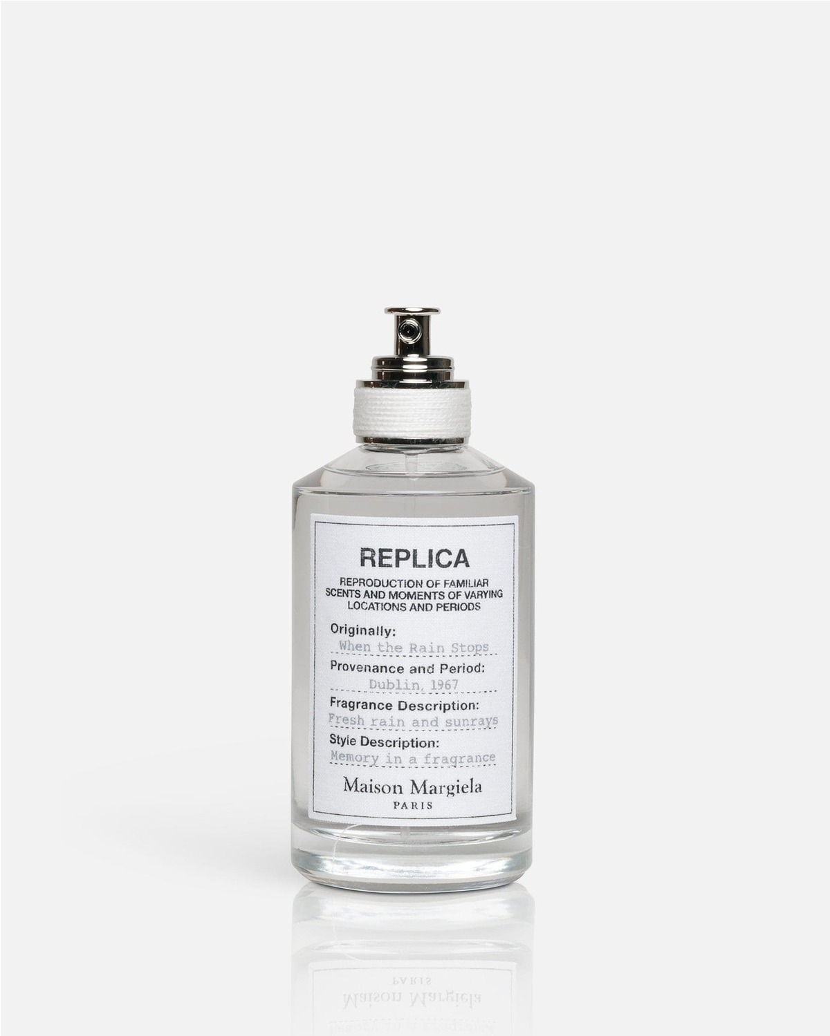 Maison Margiela 'REPLICA' fragrance in When the Rain Stops. This candle offers a fresh aquatic scent, evoking the memory of fresh rain and sun rays. Key notes include aquatic accord, rose petal and pine needle. FEATURES - Fresh, aquatic scent - Solar and fresh vibes - Key notes: aquatic accord, rose petal and pine needle - 3.4 oz