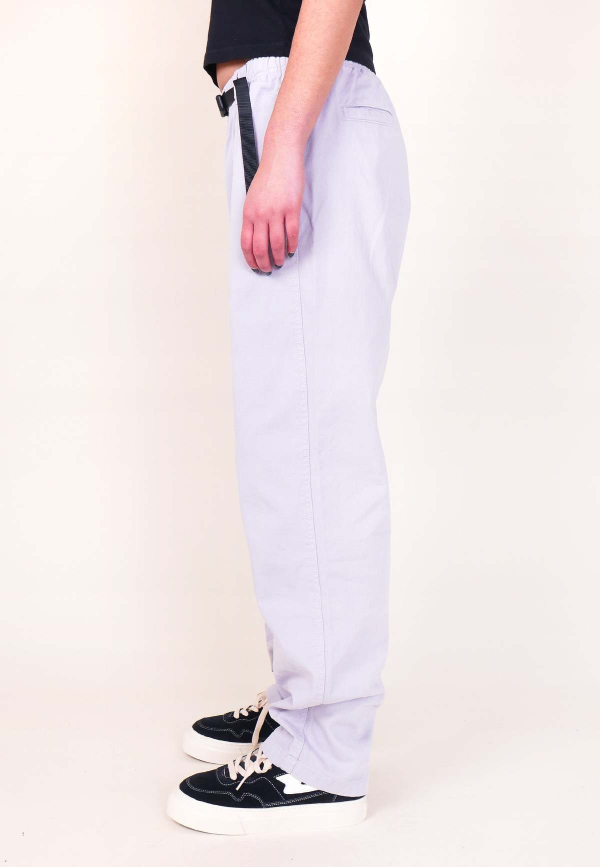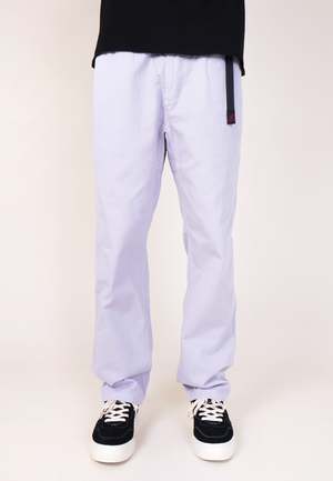 Gramicci Classic Gramicci Pants - Dusty Lavender Gramicci's reinforced G-Pants were originally created in 1988 with hiking and outdoor exploration in mind. Today, they're famed for being adaptable and comfortable. They've got four pockets, a 'Freedom of Movement' gusseted crotch and an integrated belt at the waist. Sizing: Relaxed-fit - shop to size Materials: 100% Organic Cotton Small = Mens 28-30 inch Medium = Mens 30-33 inch Large = Mens 33-36 inch - Combed Twill Fabric - Integrated Belt - Zip Fly - 2 Side Pockets - 2 Back Pocket