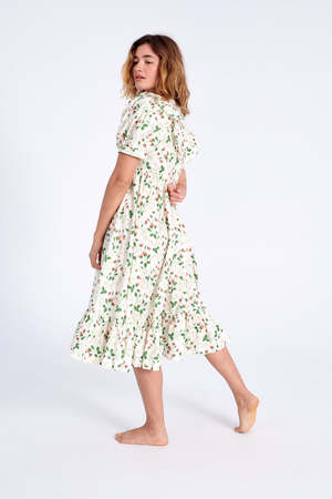 Puff-sleeved midi dress in Laura Ashley's archival Strawberry Field print with V-shaped ruffle in front. Full skirt with ruffle at bottom hem. Zipper in the back.