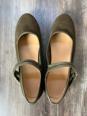 Amazingly soft and beautiful mary janes from Caron Callahan in olive suede. Brass adjustable buckle. Really decadent looking in person.