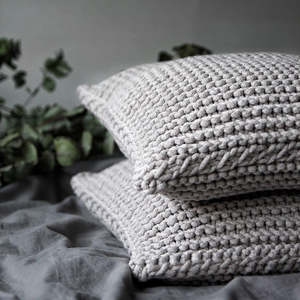 Nothing says naturally cozy like this chunky knitted cushion. This lovely little knitted pillow blends perfectly into any colour scheme and adds that handmade finishing touch. Whether for a nursery, child's bedroom or on a chair by the fire, you're sure to find a special place for this cushion. This beautiful cushion was hand-knit using eco-friendly 100% cotton cord. It's also easy to care for. Just place in the washer at 30 degrees with your choice of detergent and it will come out bright and clean again. SPECIFICATION Knitted cushion Cover material: cotton cord Inner material: 100% polypropylene and 100% polyester Available in two sizes: 45 x 45 x 10cm / 18" x 18" x 4" 60 x 60 x 10cm / 24" x 24" x 4" Washable at: 30 degrees DELIVERY: This is a 100% handcrafted made-to-order product and will be dispatched within 3-4 weeks