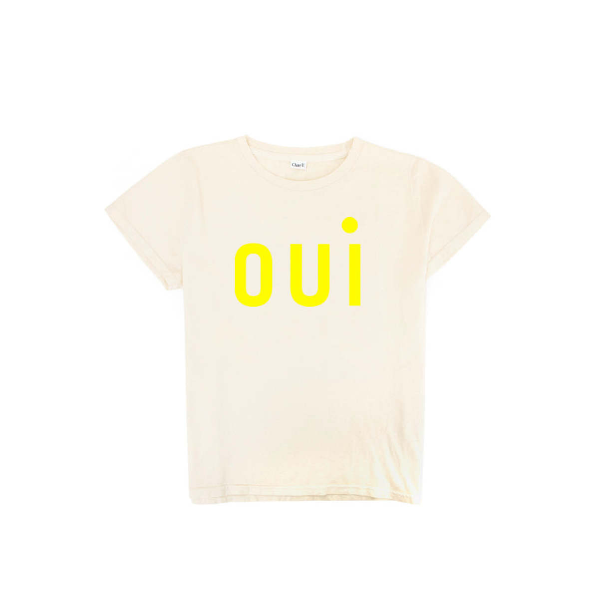 The Clare V Classic Tee in Cream w/ Neon Yellow Oui is a luxurious yet relaxed style, designed to fit closely to the body with perfectly shortened short sleeves, offering a flattering yet effortless look. It can be easily tucked into a favorite belt for a polished everyday ensemble, or left loose for an effortless appeal. 100% Cotton To ensure that your Classic Tee remains in the best condition it is recommended that you machine wash cold with like colors. Tumble dry low.