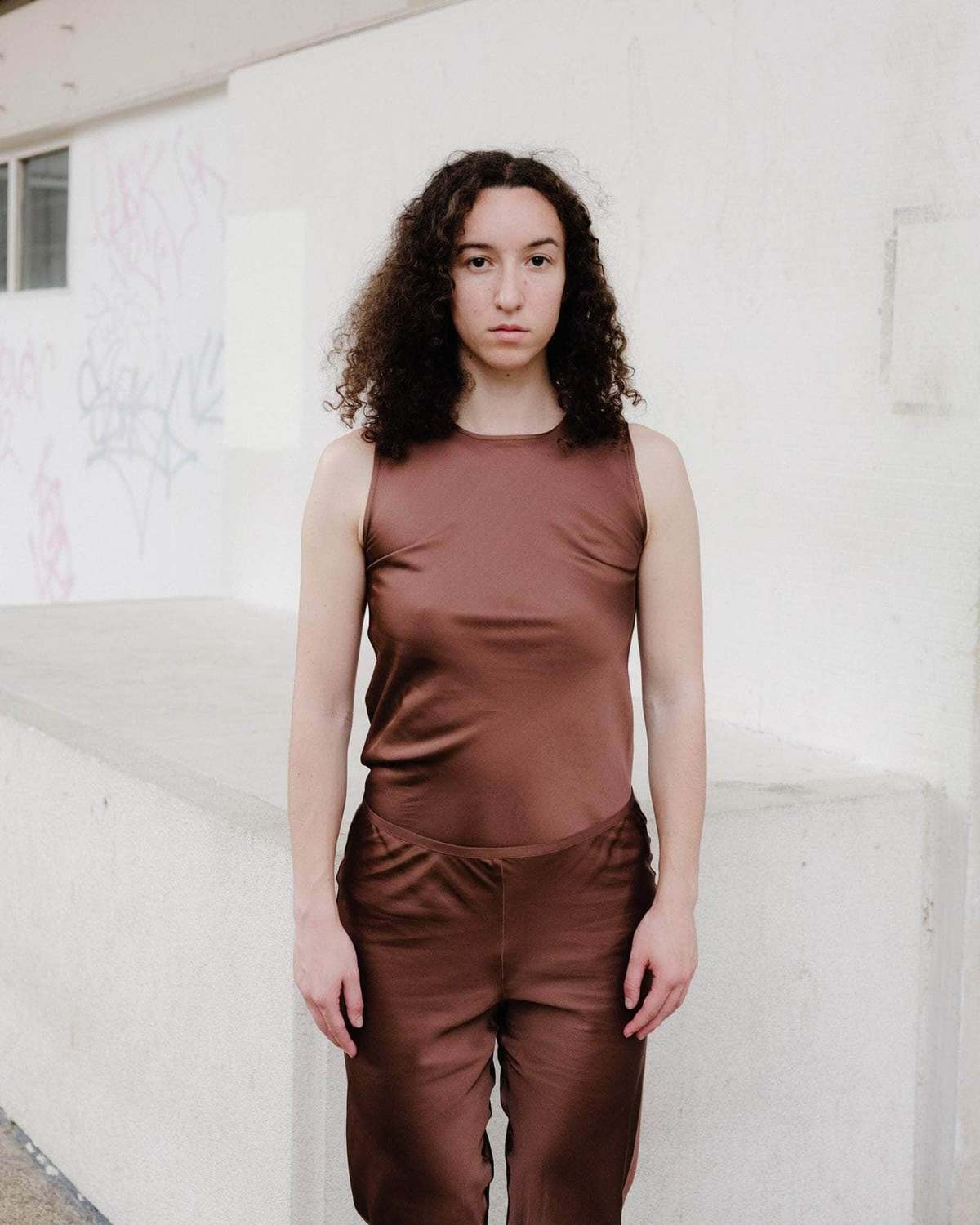 Bias-cut viscose tank top from Baserange. A longer length looks great both tucked or untucked. Back slit eliminated for production; small opening at button closure. DETAILS + FIT - 100% Ecovero Viscose - Single button closure at back neck - Fits true to size; model wears size S - Cold wash, gentle cycle - Made in Turkey