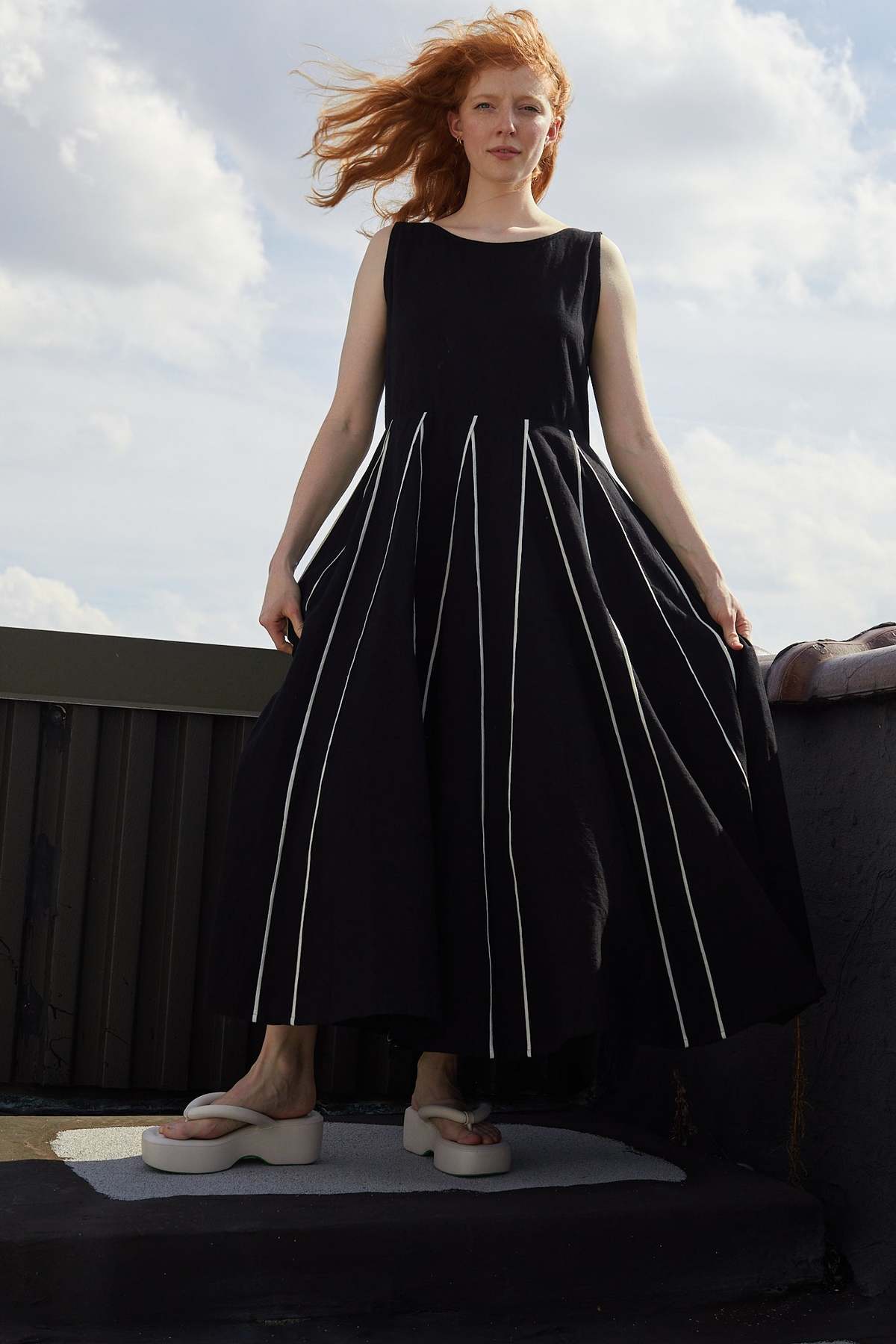 - Sleeveless, flared swing dress with flowy movement - Round neckline - Contrast piping detail - Criss cross back detail - Pockets at side seam - Hem hits mid calf - Perfect style for any occasion Model 5' 9 | Size S 55% LINEN 45% COTTON Simply toss them in the washing machine on a cool-to-warm setting with like color. Tumble-dry low and remove promptly to avoid wrinkles. Warm iron if needed. Designed In New York | Handcrafted In India