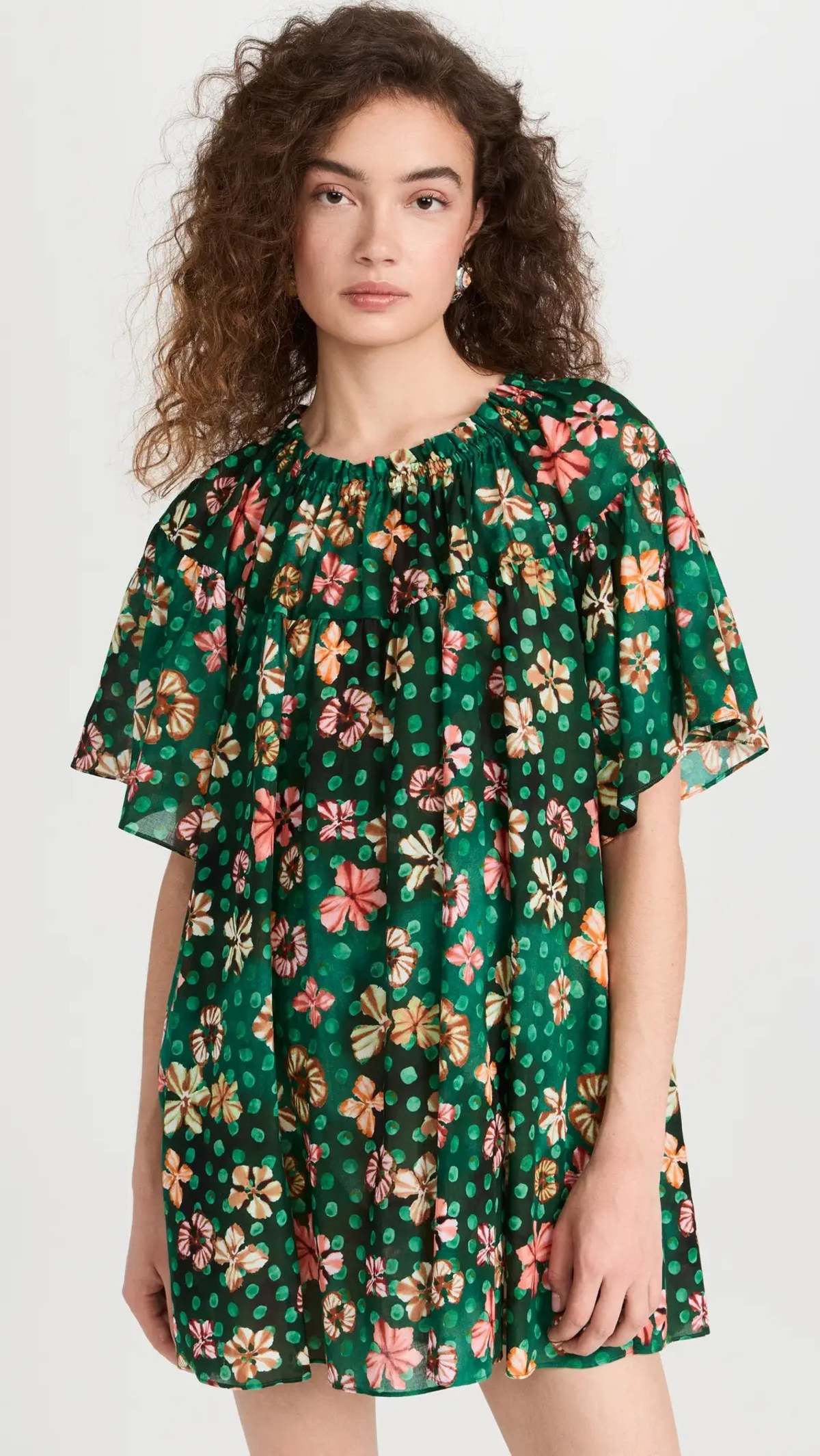 Printed with a bright floral design, Ulla Johnson's Gallia cover-up minidress showcases a smocked off-the-shoulder neck. - Smocked off-the-shoulder neck - Elbow length sleeves - Pulls over - 55% cotton / 45% viscose This style is designed for a relaxed fit - About 29" from topline to hem VIRIDIAN