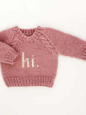 What a fun way to greet the world! Say hi. with our cozy pullover sweater knit in Surf Blue hued yarn. It has cable trim raglan sleeves with hi. knit into the front in Natural yarn. The neck is softly knit, making it easy to pull over little heads. Hand-knit in chunky yarn, it is soft and warm. This is such a great sweater, perfect for any little girl. Our sweaters are partially knit from recycled, sustainable Polyester yarn made from plastic bottles. We are on a mission to help reduce the world's plastic pollution problem