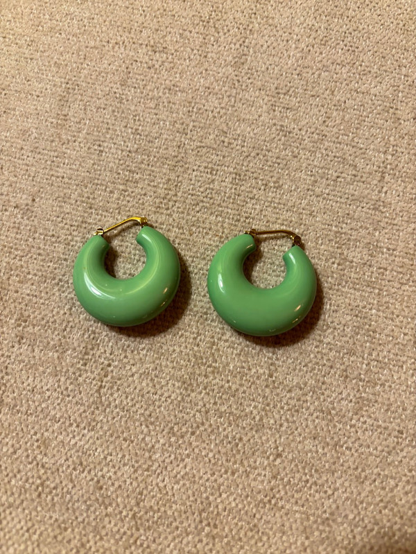 Chunky acrylic hoop earrings with hinged fastening for pierced ears. Worn once. Just not my style. 2 tiny tiny white spots on one of the earrings, pic included but it's hard to see. Third photo is to show how it looks on a person but is not the color of the item.