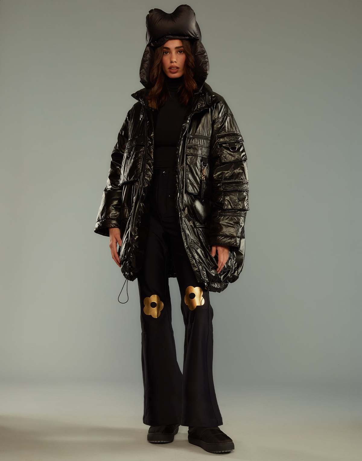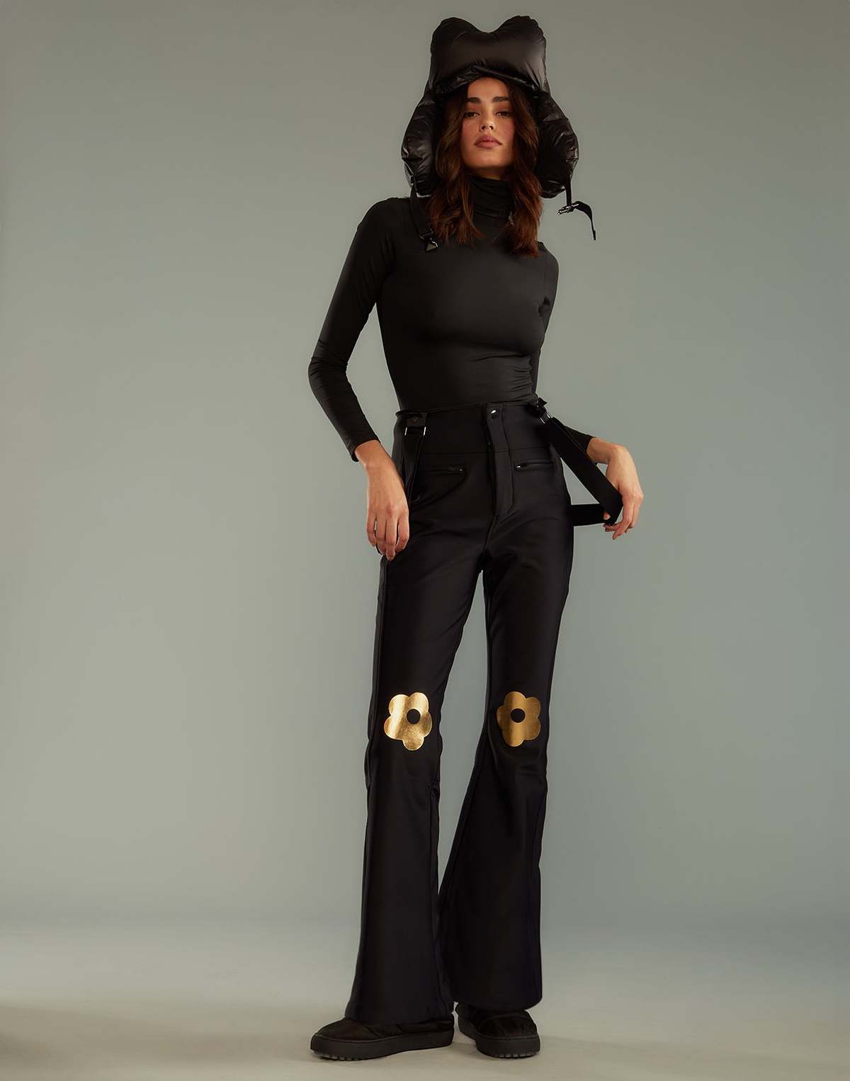 Black matte ski pants with gold foil flower detail - Stretchy fleece backed nylon - Front zipper with fly closure - 2 front zipped pockets - Removable suspender belt - Extension gussets with zippers at bottom leg with elastic ankle lining - Fabric content: - Surface: 85% nylon, 15% spandex - Base: 100% polyester - Care instructions: Machine wash cold inside out with belt removed and zipper closed. Measurements from size S: - Length (without suspender belt): 40" - Inseam: 28'' Complete the look: Cargo Pocket Puffer Coat, Cloud Trapper Hat