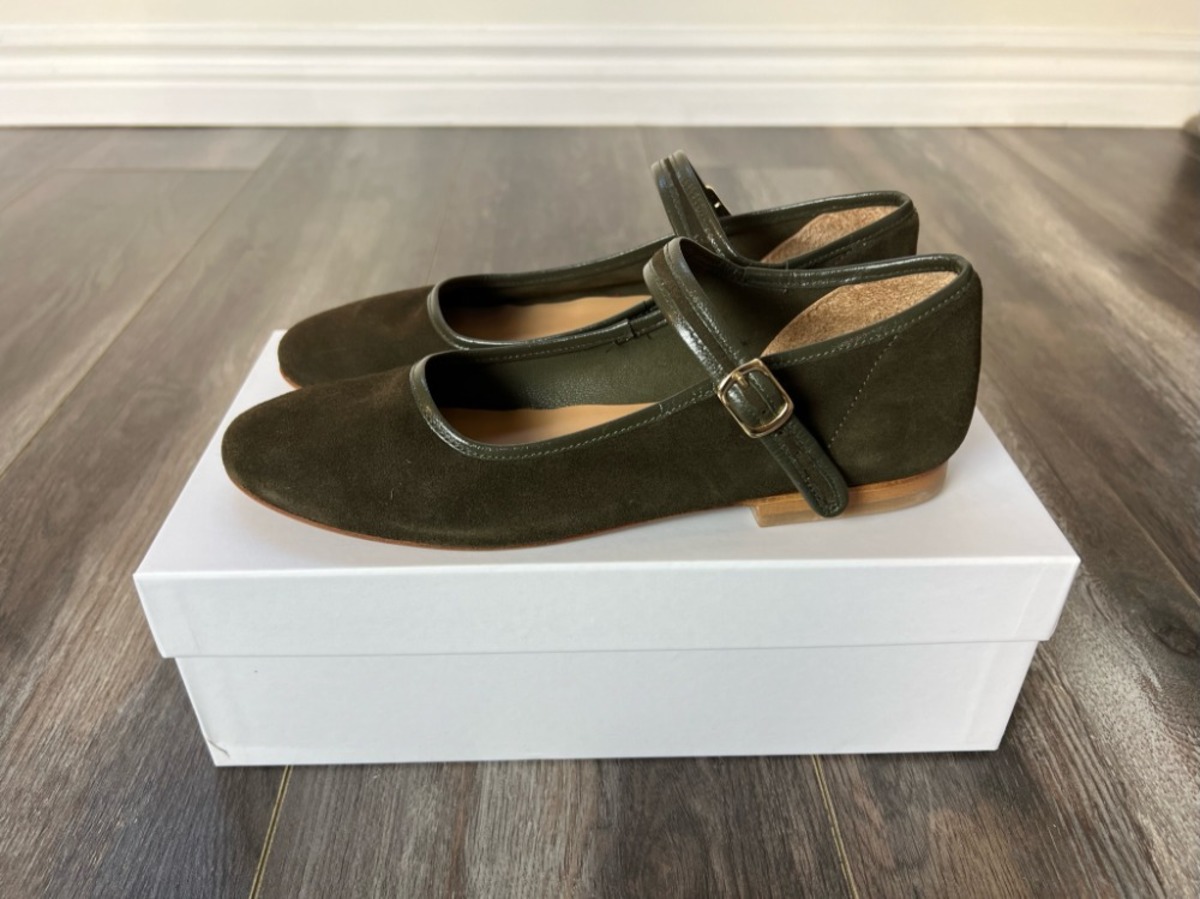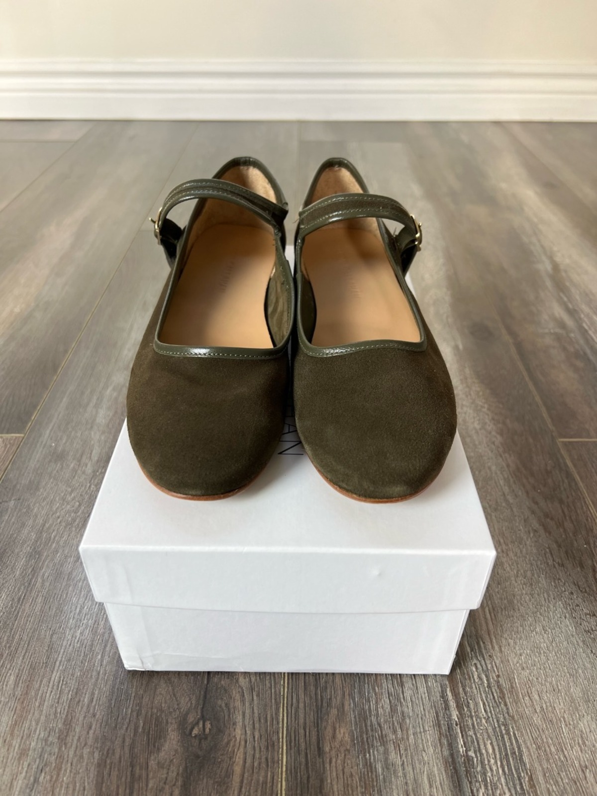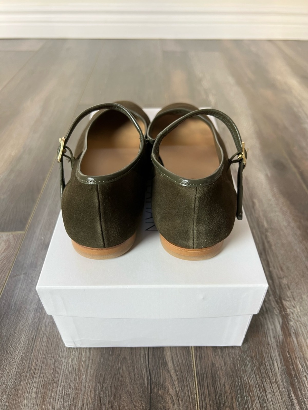 Amazingly soft and beautiful mary janes from Caron Callahan in olive suede. Brass adjustable buckle. Really decadent looking in person.