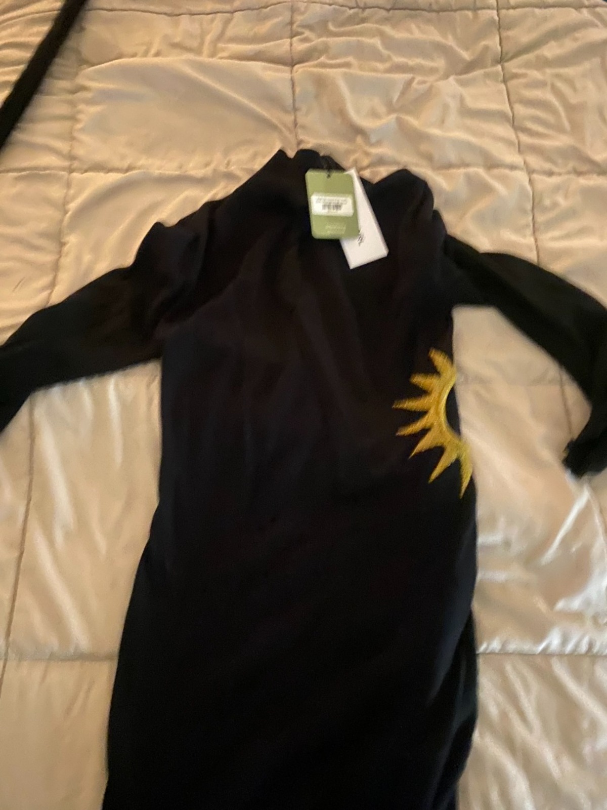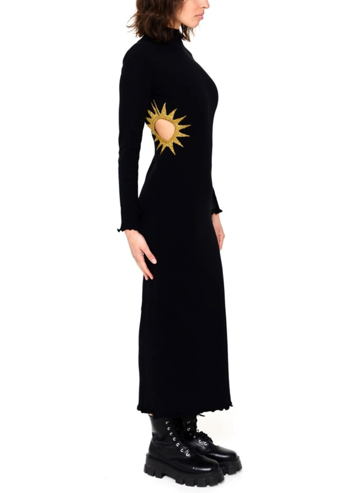 Add a little sunshine to your life this season with this lurex sun maxi dress. This knitted maxi is made from organic cotton for a soft luxurious feel, featuring a golden lurex sn cutout on the side. The dress has a high neckline and a frilled hem for those extra little details. Never worn, brand new. Just tried on once.