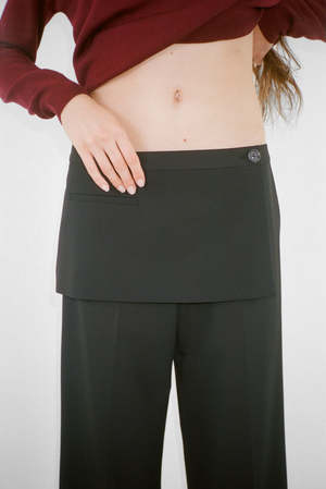 By Sandy Liang The Uniform Shop features a collection of essential pieces inspired by Sandy's love for all things uniform. This assortment of pleated skorts, cotton shirts, pinafores, knits, and pants are meant to be worn together and separately, allowing you to create a personal uniform for your everyday life. Mid rise pants in a suiting fabric Boxy and slightly cropped wide leg fit Features apron detail with welt pocket Made in NYC Size Waist Low Hip Inseam 0 29" 37 3/8" 26 5/8" 2 30" 38 3/8" 26 5/8" 4 31" 39 3/8" 26 5/8" 6 32" 40 3/8" 26 5/8" 8 33" 41 3/8" 26 5/8" 10 34" 42 3/8" 26 5/8" 12 35 1/2" 43 7/8" 26 5/8"