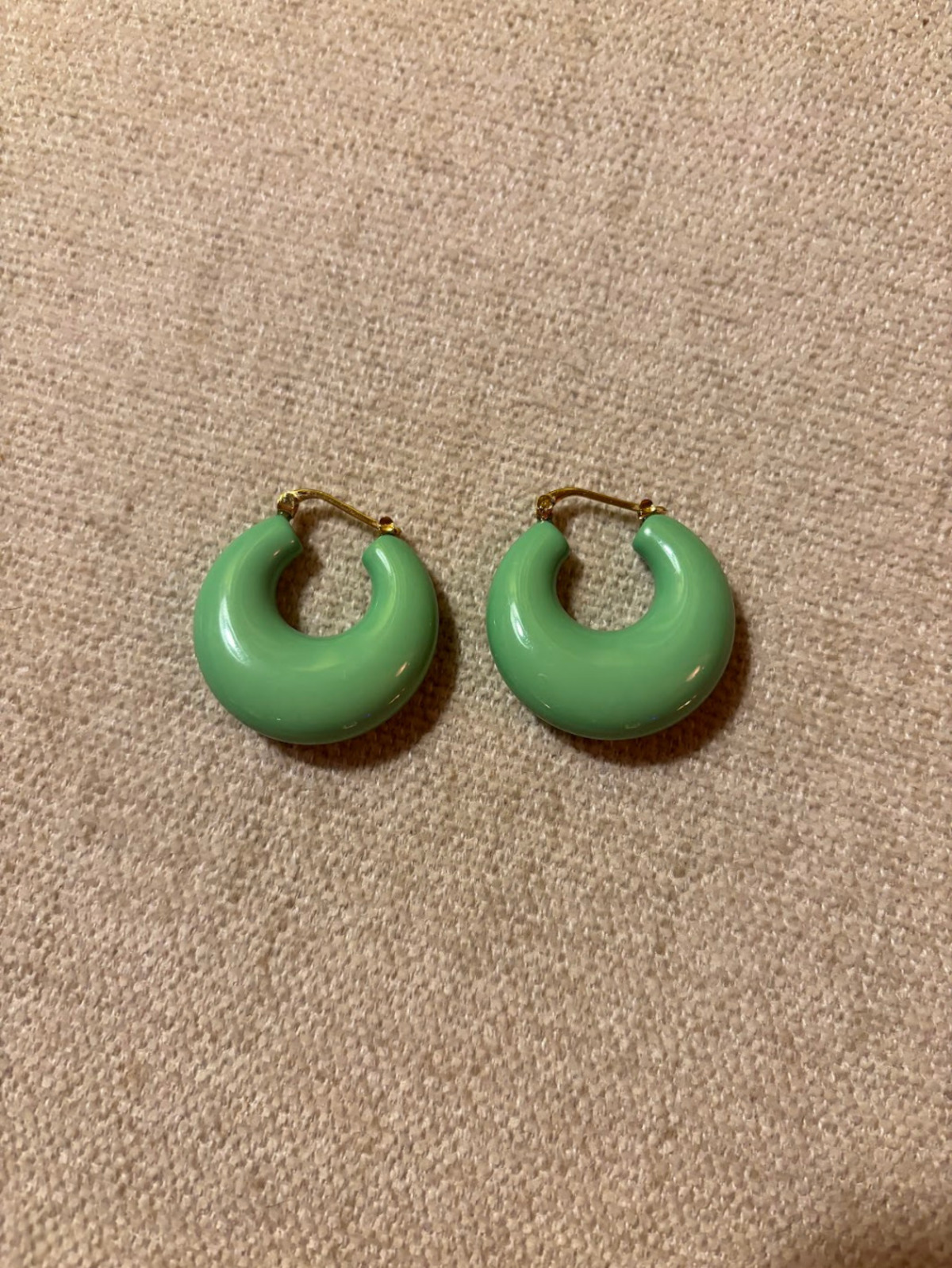 Chunky acrylic hoop earrings with hinged fastening for pierced ears. Worn once. Just not my style. 2 tiny tiny white spots on one of the earrings, pic included but it's hard to see. Third photo is to show how it looks on a person but is not the color of the item.